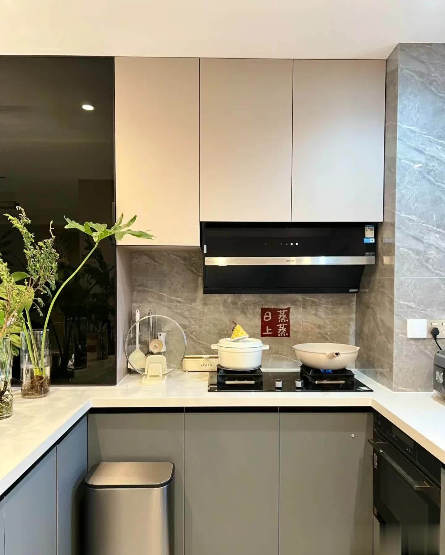 橱柜U型布局,开放式设计,柜门是灰色平板门,台面是石英石台面。冰箱选择内嵌进去。