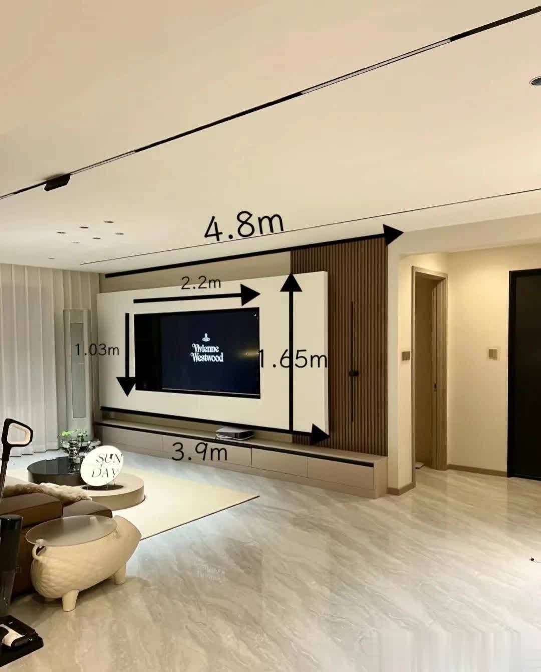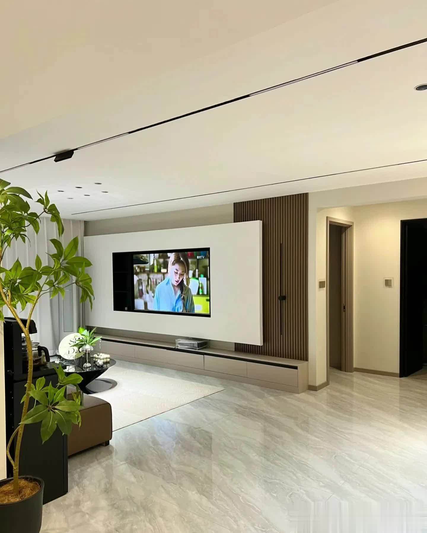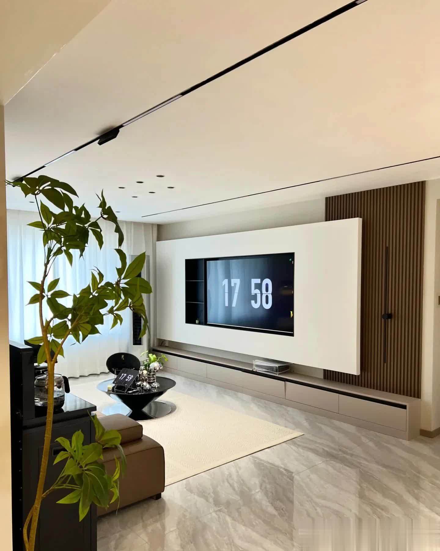 客厅区域电视背景墙造型简洁,看着却很舒服、高级。用石膏板做造型,电视内嵌,旁边搭配木格栅,底下还有一排落地电视柜,简洁又美观。
