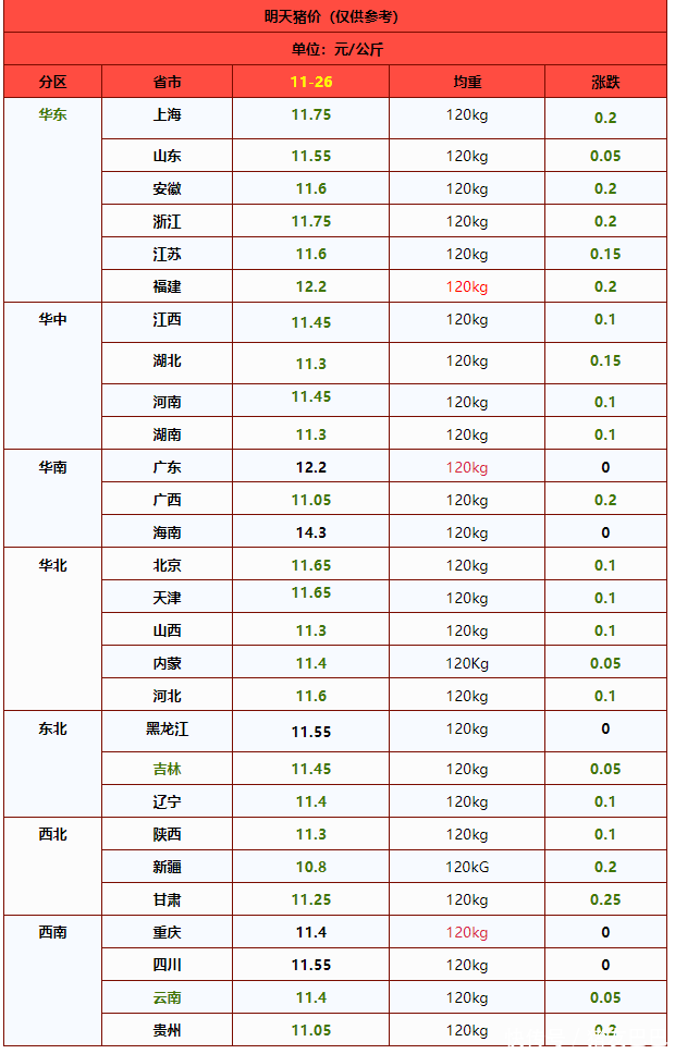 据数据显示,受屠宰场调价,预计,11月26日,外三元标猪报价在11.59元/公斤,下降0.11元,生猪报价偏弱运行,短期内,猪价或盘整在11~12元/公斤,后市重点关注生猪购销情绪的变化!