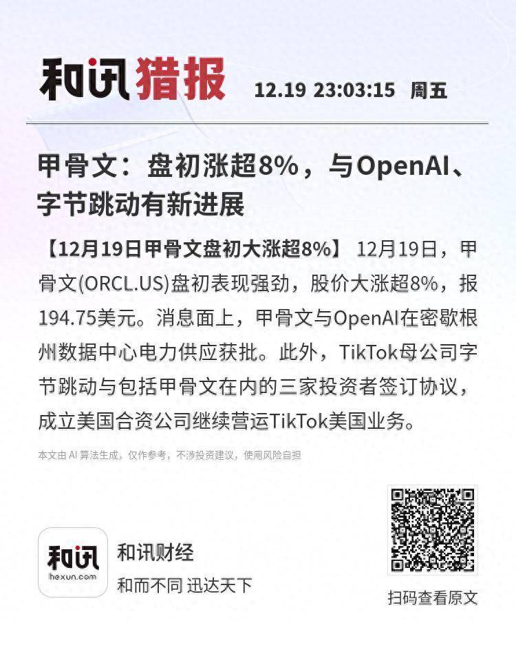 【12月19日甲骨文盘初大涨超8%】12月19日,甲骨文(ORCL.US)盘初表现强劲,股价大涨超8%华丰金服,报194.75美元。消息面上,甲骨文与OpenAI在密歇根州数据中心电力供应获批。此外,TikTok母公司字节跳动与包括甲骨文在内的三家投资者签订协议,成立美国合资公司继续营运TikTok美国业务。